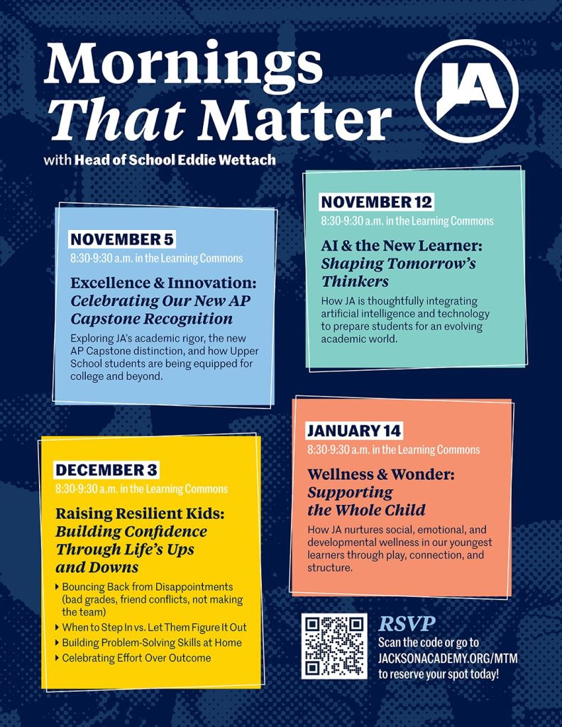 Jackson Academy is excited to introduce Mornings That Matter with Head of School Eddie Wettach. This four-part series, taking place from November to January, will focus on current topics relevant to JA parents of all ages. Each event is an opportunity to engage and connect with school leadership.