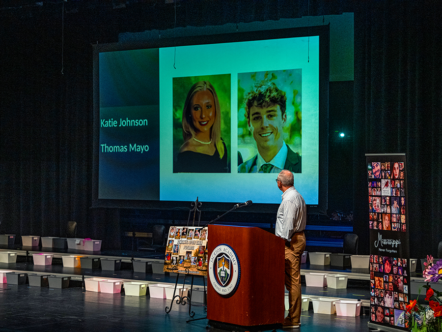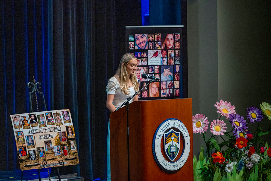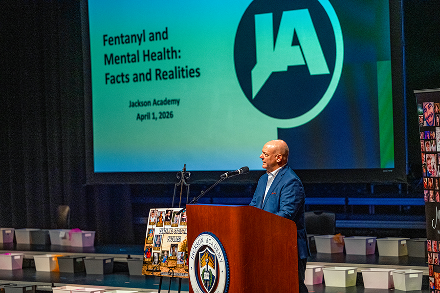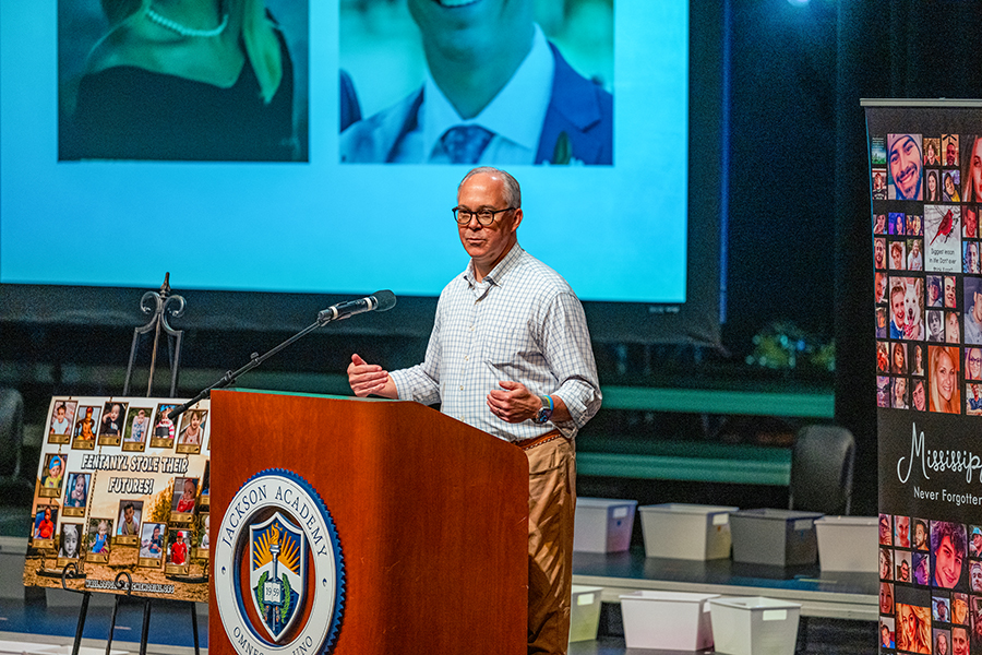 Two families, along with representatives of the University of Mississippi, Mississippi State University, and Attorney General Lynn Fitch’s office were at Jackson Academy last week for presentations about misuse of controlled substances, such as Fentanyl, recognized in recent years as the leading cause of death for ages 18-45. The first session was tailored for an audience of ninth through twelfth graders, while the second session reached an audience of parents from JA and neighboring schools.