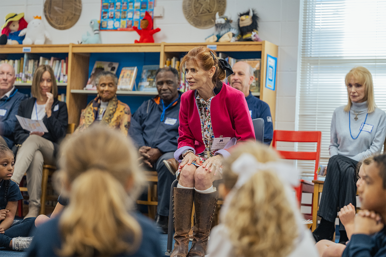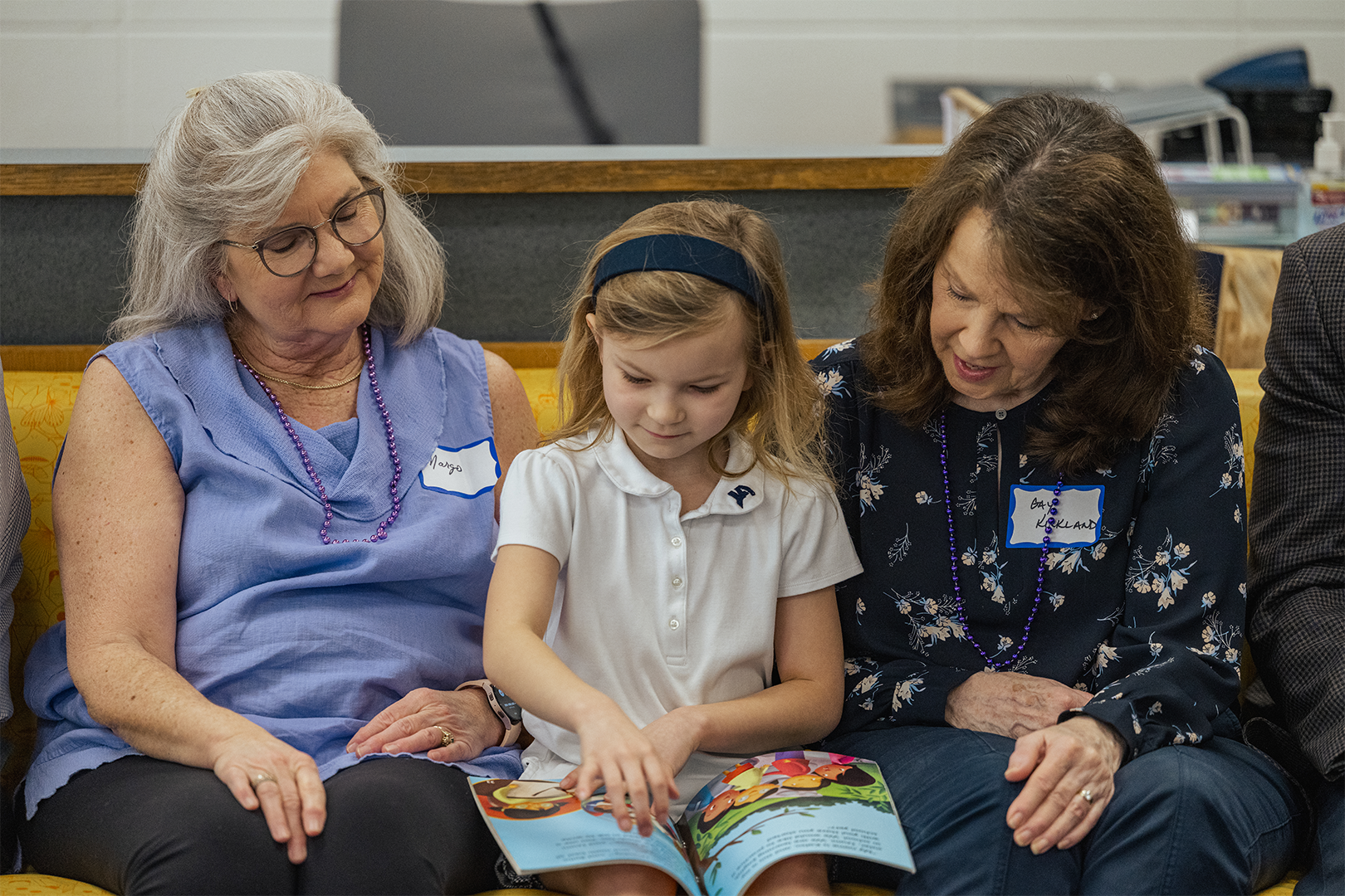Each first-grade class and its guests visited the Lower School Library. The library rotation began with a devotional that incorporated the Bible verse from Colossians 3:20 that the students have memorized for February: “Children, obey your parents in everything for this pleases the Lord.” First-grade teachers demonstrated Morning Meeting, a daily classroom activity that builds students’ social skills in listening, interacting with, and caring for others. Then, grandparents listened as their grandchild read them a story aloud—an activity that builds confidence and a love of reading in young learners.
