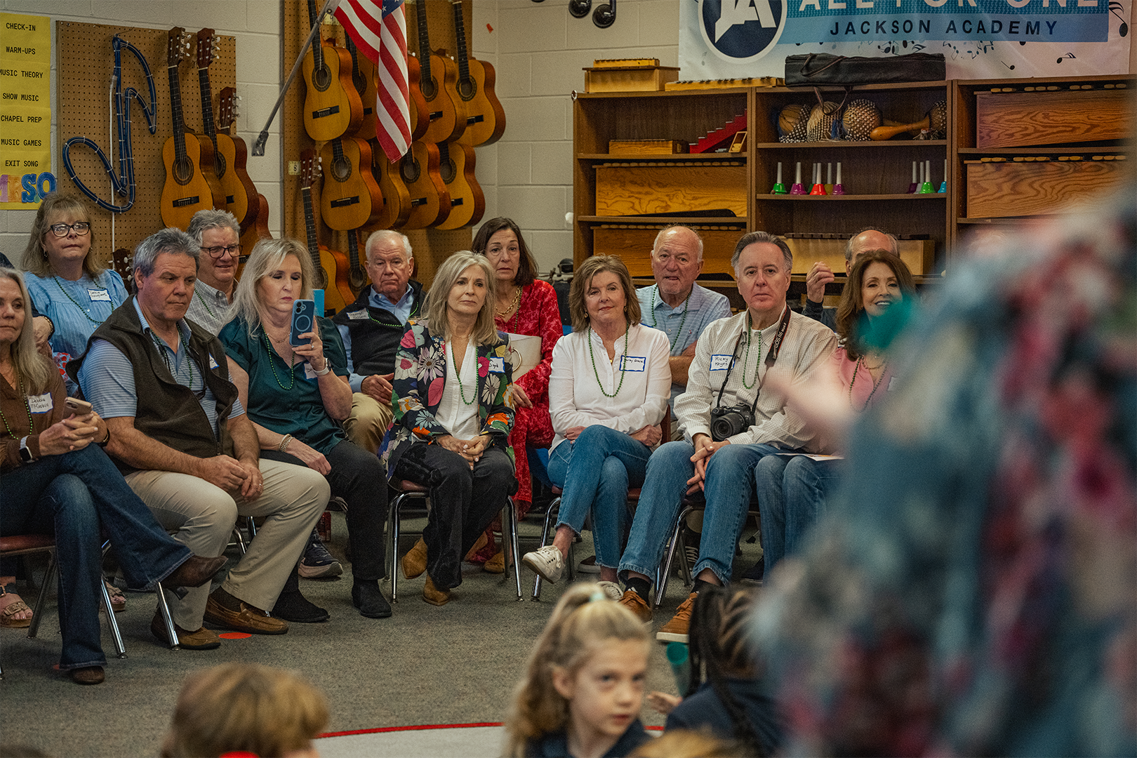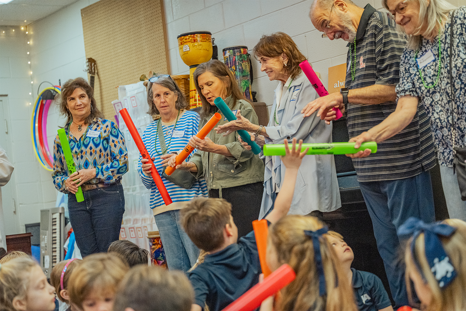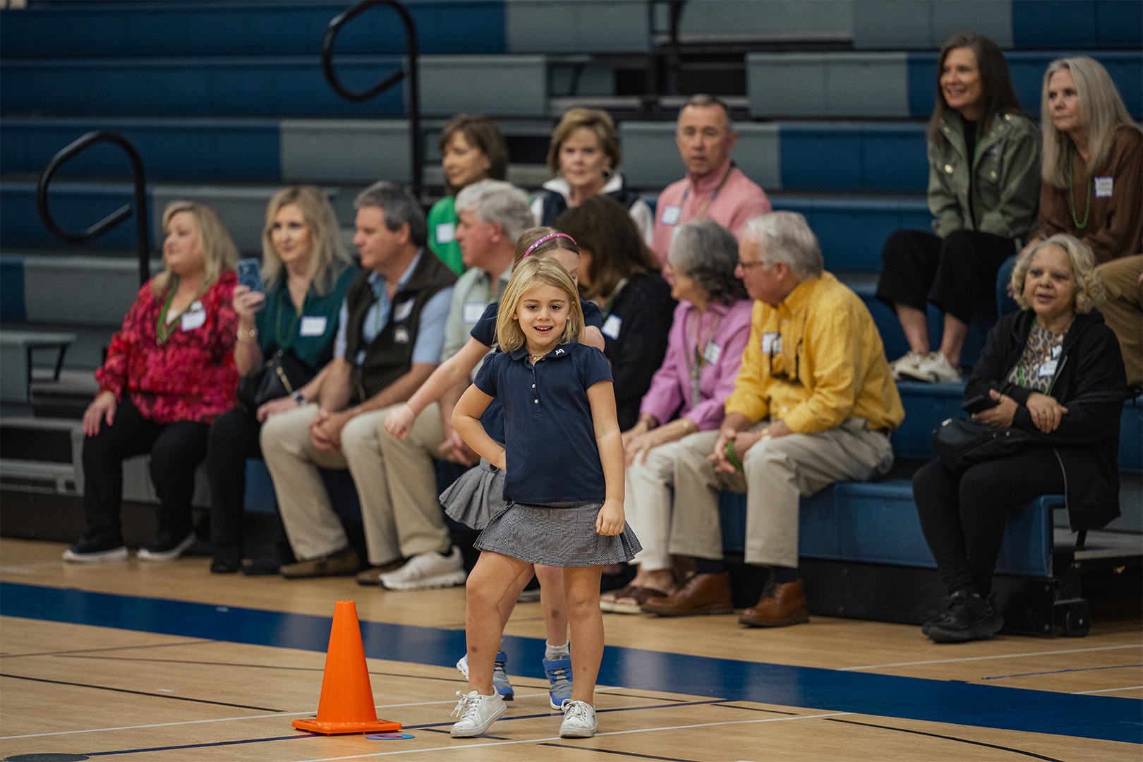 In physical education, students demonstrated their skills by teaching grandparents a game called Bucket Coin Toss, showcasing PE as an original element of JA’s programming that remains essential to the curriculum today. This game focuses on locomotor skills, underhand tossing, and counting. Music class brought joyful energy as first graders demonstrated how they build rhythm and musicality through song and movement. STEM class wowed grandparents with hands-on demonstrations of how science, technology, engineering, and math are taught today—making many wish they could return to school themselves. During Spanish/Bible class, the students impressed their elders with their Spanish vocabulary and Bible knowledge, including the books of the Bible!