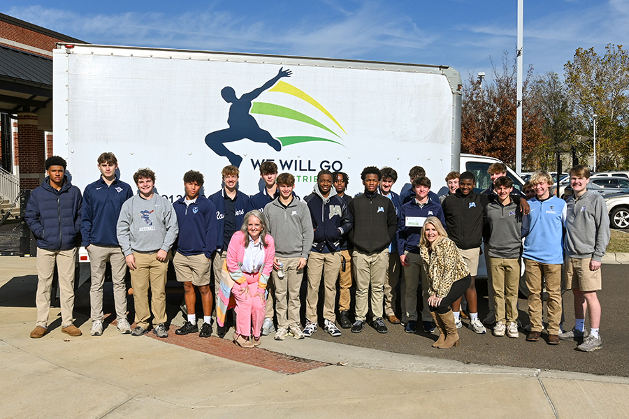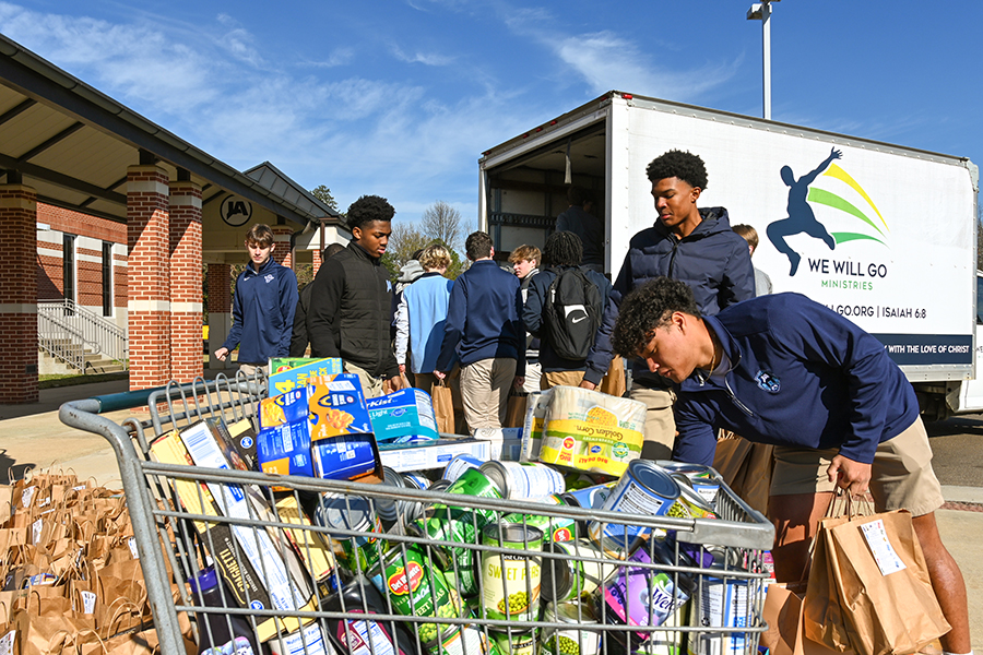 Loading the We Will Go truck with the canned goods collected by students of Jackson Academy are (from back, left) Tripp McGowan, Miles Davis, Grant Taylor, Amari Felton, Cooper Griffin, Whit DavisJosh Menogan, Ben Chapman, Nick Rula, Colemon Edmonson, Peyton Smith, Alex Estess (front, left) Director of Community Programs Sissy Ingram, Hayley Barbour, Caleb Levy, Jordann Walker, Anderson Mehrle, Alvin Thomas, Luke Mann, Parker Thomas, Sam Seward, and Director of Engagement Laurie Cutrer.