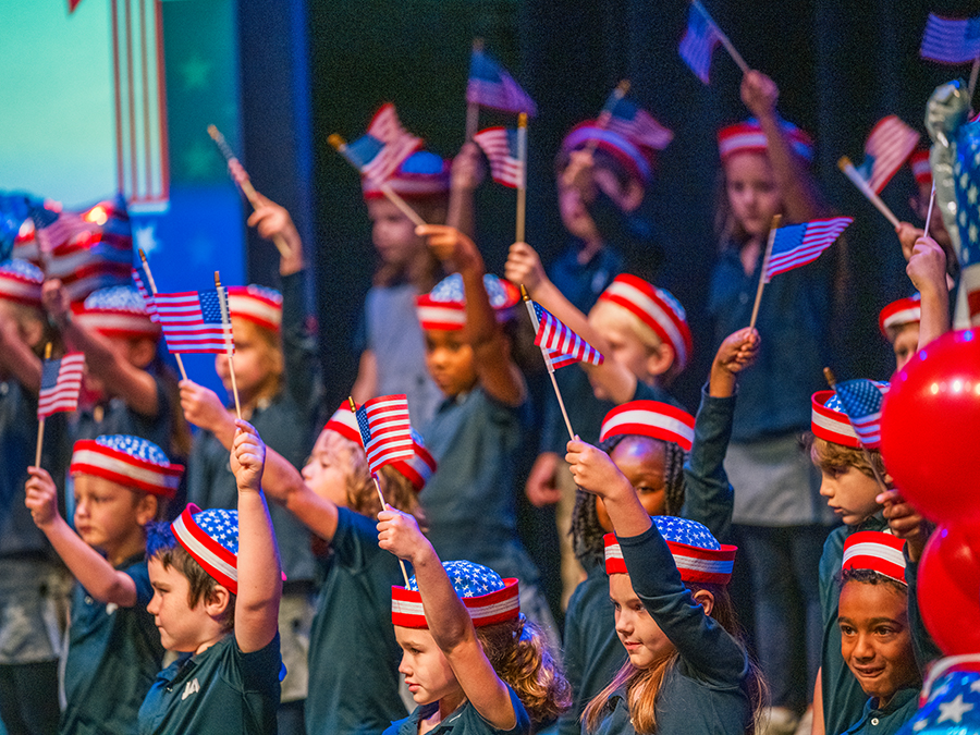 At 10 a.m., Preschool students gathered in the Activities Building wearing festive patriotic hats—some resembling Lady Liberty’s crown, others styled after Uncle Sam’s top hat. Each of the three grades performed a patriotic song for an audience of Lower School students and veteran parents.