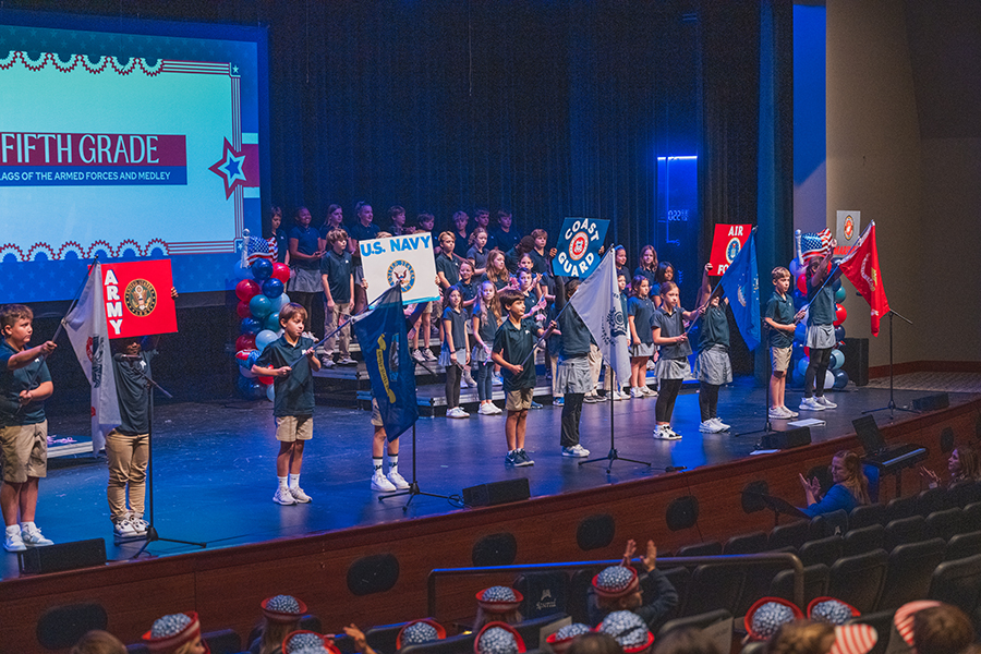 The Lower School opened Tuesday morning with a Patriotic Program in the Performing Arts Center. Students delivered readings, performed patriotic songs, and presented military branch anthems while displaying corresponding flags. Veterans in attendance stood for recognition as their fellow audience members applauded their service.