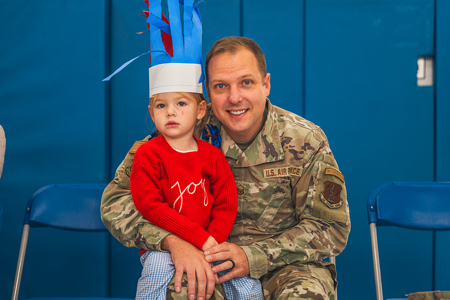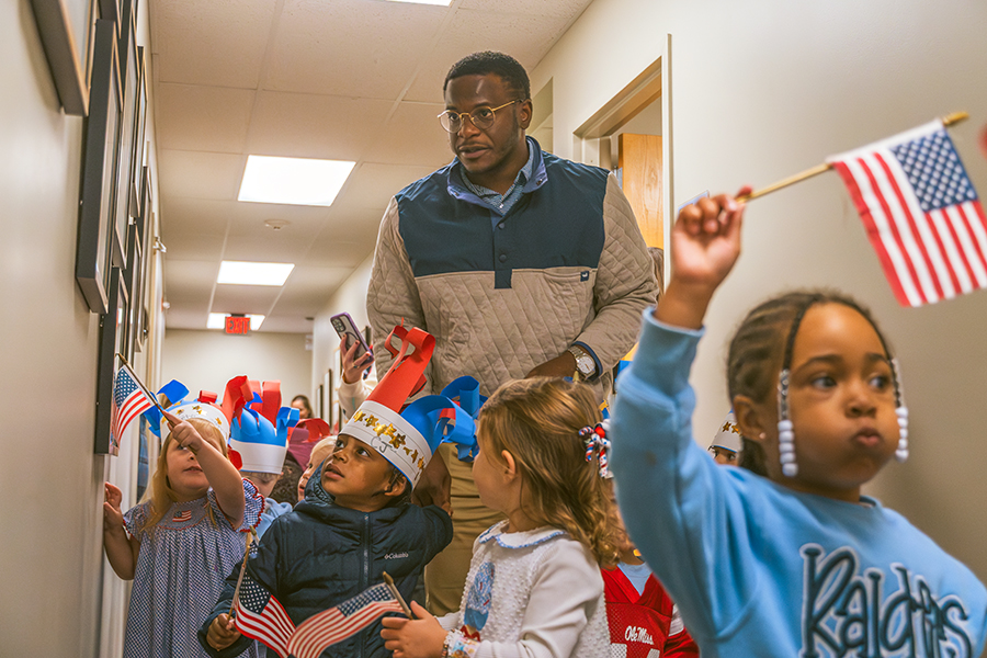 Following the performance, JA’s youngest Raiders paraded through campus buildings in a sea of red, white, and blue. Preschoolers from K4 down to the two-year-old class proudly waved handmade crafts celebrating Veterans Day, greeting staff members, exchanging fist bumps with familiar faces, and sharing hugs with parents who work at JA.