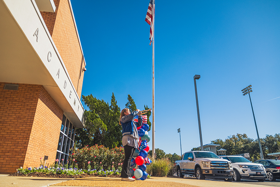 As the clock turned to 11:00 a.m., a lone trumpet played by senior Mac Harris sounded across campus as part of a nationwide event called Taps For Veterans, in which buglers usher in two minutes of remembrance by playing Taps at 11 a.m. on November 11. Those two minutes have commemorated the end of World War I since the first observation of Armistice Day in 1919. In America, those two minutes are also dedicated to remembering the men and women who are veterans of all of this nation’s wars.